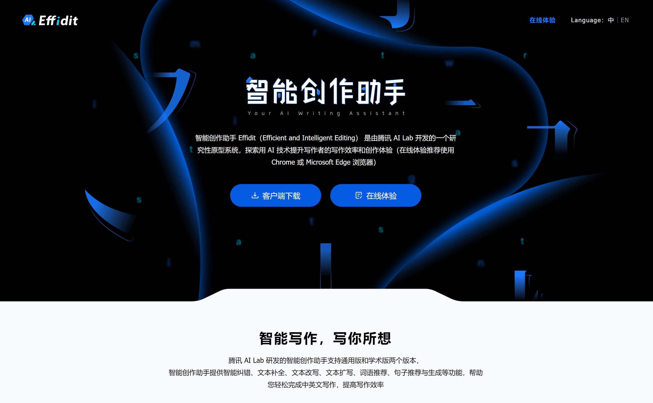 Effidit(Efficient and Intelligent Editing)是由 腾讯 AI Lab 开发的一款 AI 辅助写作工具,旨在通过人工智能技术提升用户的写作效率和创作质量。它支持中英文双语的智能处理,适用于日常写作、学术研究、文案创作等多种场景。